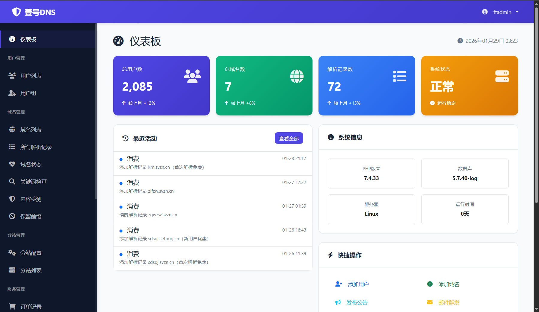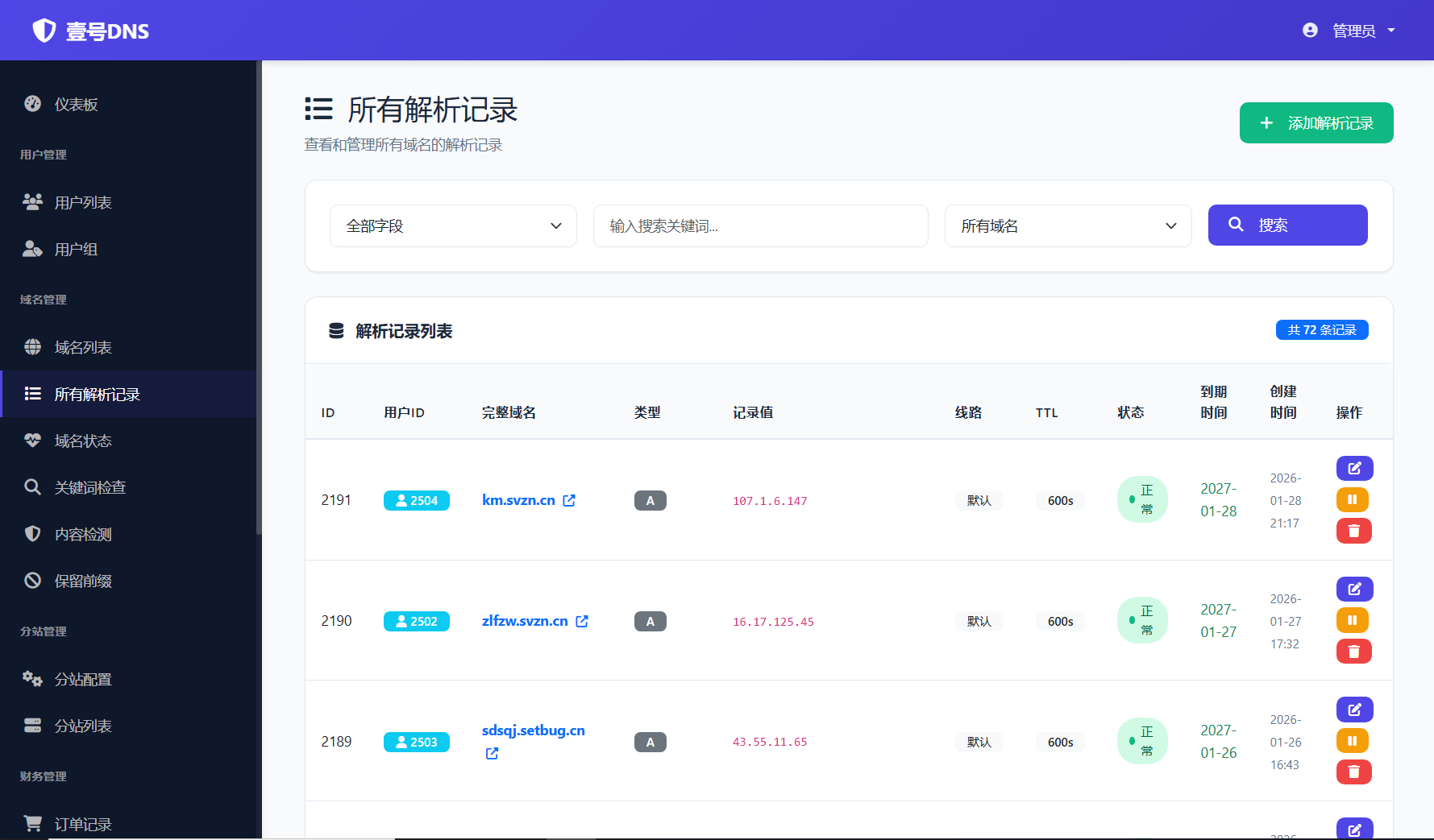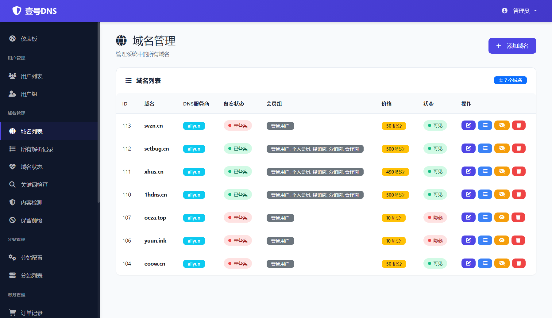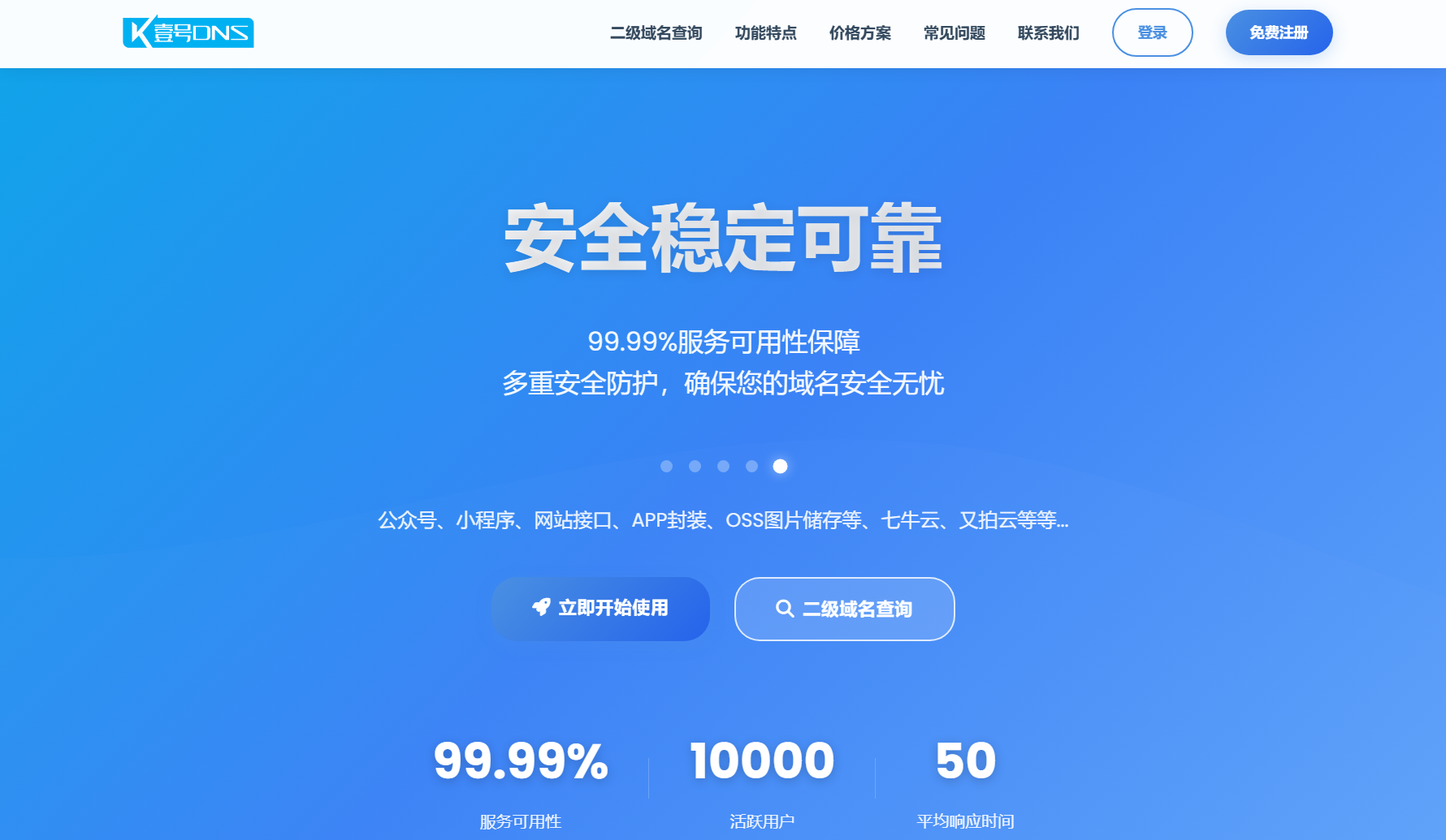 壹号DNS是专业的二级域名解析服务平台,提供免备案域名分发、实时DNS解析、智能负载均衡等服务。支持公众号、小程序、APP封装、OSS存储等多种应用场景,99.99%服务可用性,毫秒级生效,7x24小时技术支持。